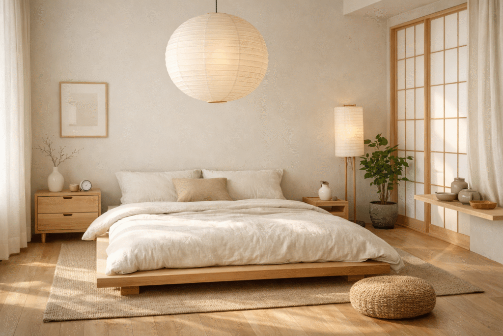 Caracteriza-se por linhas limpas, móveis baixos, paletas de cores neutras com toques de preto e verde-sálvia, e o uso abundante de materiais naturais como madeira clara, cerâmica e papel.